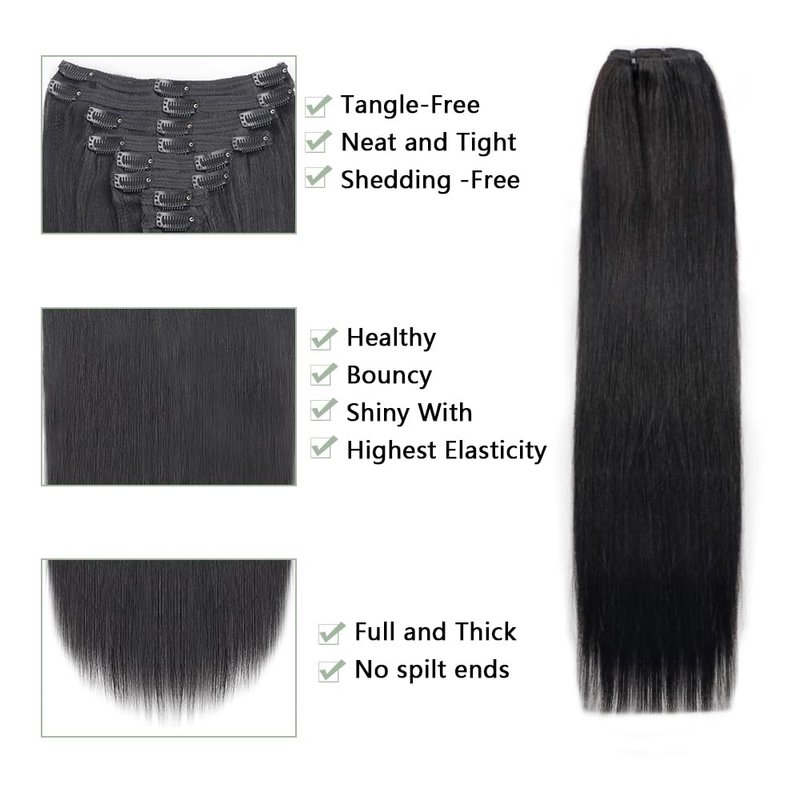 Lysilf Yaki Straight Clip in Hair Extensions for Black Women Brazilian Virgin Human Hair Kinky Straight Clip in Extensions 8Pcs with 18 Clips Double Lace Weft 120Gram(20inch, Natural Black)
