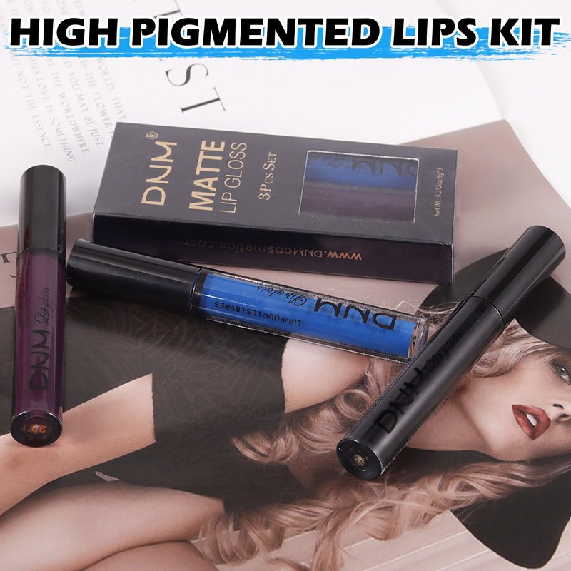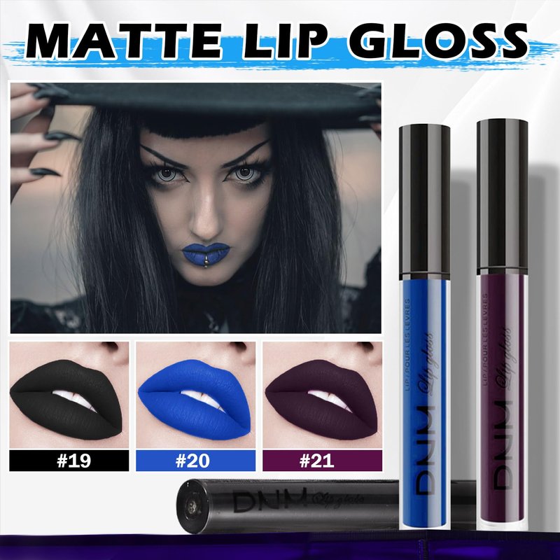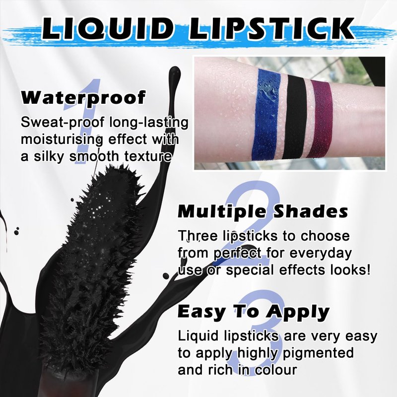 Halloween lipstick,contains black blue dark purple lipstick halloween,easy to apply,fits perfectly on lips, brings full coverage color to lips,creates a variety of styles of lip makeup,and highlights fashion personality.1.Long-lasting color,liquid lipstick is made of ultra-fine pigments,highly pigmented,non-sticky,non-fading,and waterproof,which can maintain sexy and charming lip makeup all day long.2.Nourish and moisturize,rich in luxurious natural ingredients,gently nourishes lips,provides long-lasting moisturizing effect,prevents dry lips from peeling,and makes lips soft and comfortable.3.Premium matte texture,the texture is velvety and light,with zero-gravity silky feeling.It presents a premium matte effect after application,and the unique color combination adds a dramatic effect to the lips