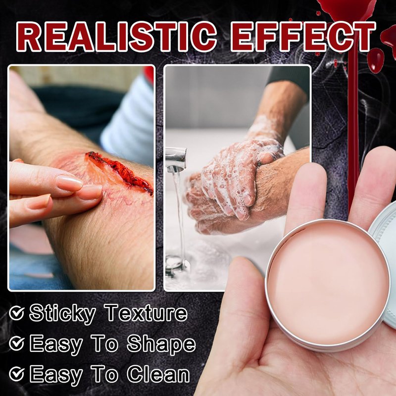 - 【Realistic Sfx Special Effects】Scar wax is moldable,and a spatula can be used to create scars,facial tears,bullet holes,etc.;coagulated blood is used with a sponge to color the wound;face paint is used to design a clown image,easily achieving realistic sfx special effects