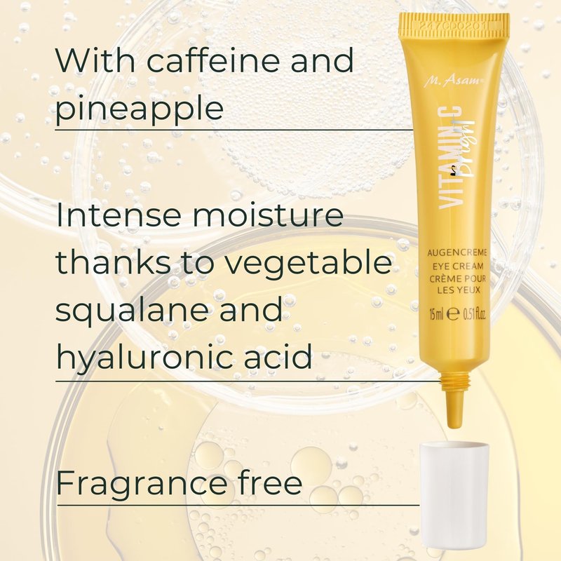 Experience the refreshing and revitalizing power of M. Asam VITAMIN C BRIGHT Eye Cream, a delicate formula designed to combat signs of fatigue and sagging contours around the eyes. This eye cream features a unique Vitamin C gold complex that stabilizes and enhances the effectiveness of Vitamin C by binding it to pure gold. This powerful antioxidant combination protects the delicate eye area from environmental stressors and supports the skin's collagen structure for increased resilience. Infused with caffeine and pineapple extract, this eye cream reduces puffiness and dark circles, giving your eyes a brighter and more awake look. The high-tech Beautifeye complex smooths and firms the skin, even targeting the upper eyelids for a more open and youthful gaze. Hyaluronic acid and vegetable squalane provide deep hydration, plumping up fine lines and wrinkles, while apricot kernel oil nourishes and softens the skin. Ideal for all skin types, especially normal to dry and sensitive skin, this eye cream is perfect for those seeking to address pre-aging and anti-aging concerns. It is free from fragrance, silicones, and microplastics, making it suitable for sensitive skin. Whether you're dealing with dark circles, puffiness, or fine lines, this eye cream offers a comprehensive solution for a refreshed and youthful eye area. Apply this cream in the morning and evening to cleansed skin, gently patting it into the eye area. Its lightweight and fast-absorbing texture ensures a comfortable feel, making it an excellent addition to your daily skincare routine.
