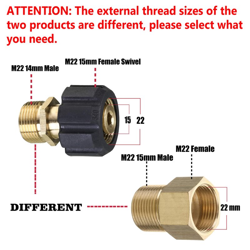 - If not sure which fitting on the pressure washer accessory, please measure the outsize diameter of inside plug at the female end or measure the inside diameter of male end. If 14mm, it is M22 14mm fitting. If 15mm, it is M22 15mm fitting. Pressure washer coupler connects power washer gun to hose, hose to pump.