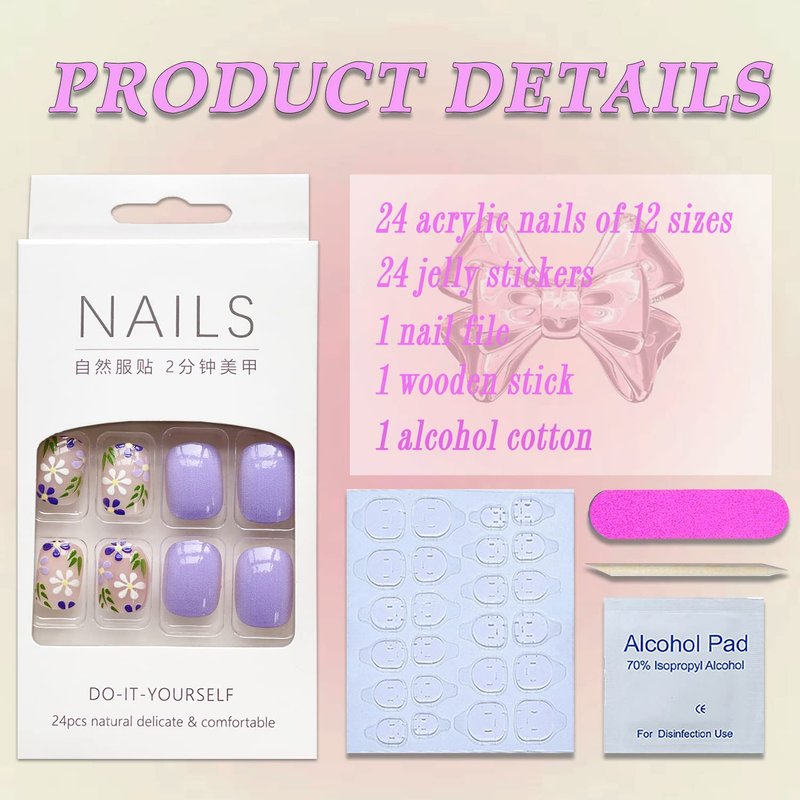 - 【Package Content】You will get 24 acrylic nails of 12 sizes, 1 nail file, 24 jelly stickers, and 1 wooden stick for removing false nails.