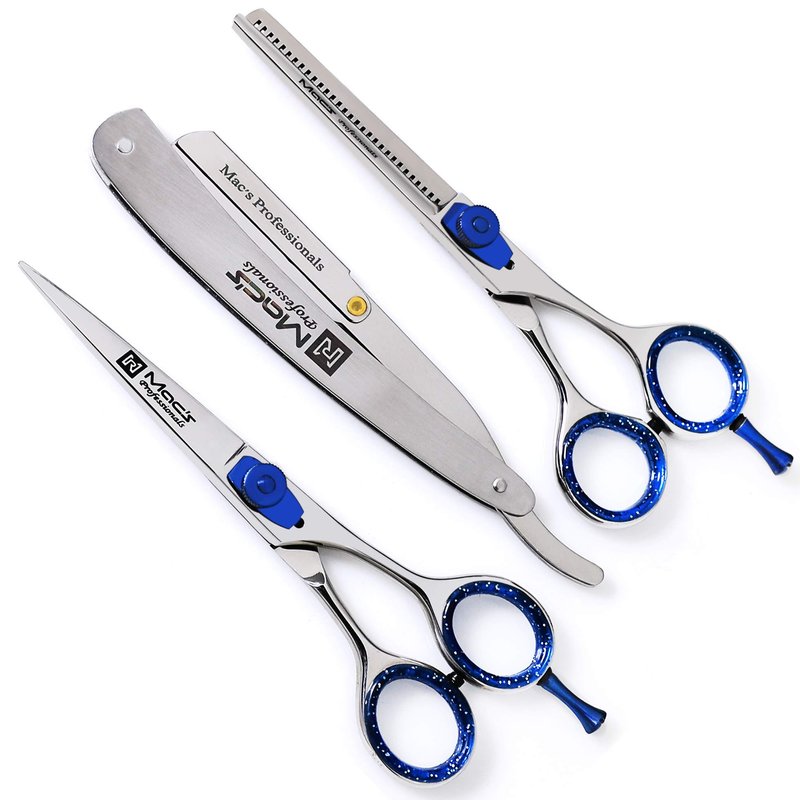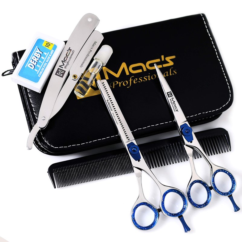 4 PCS MACS BARBER SET Professional Quality Barber Set Contain 5 PCs 1 Barbers Shears 1 Thinning Shears 1 Exchangeable Blade Razors 1 PCs Of Comb And 1 Oil Bottle 1 Titanium Barber Shears 6." Size With finger Rest The Blade Size 2.5" Total Size With Out Finger Rest Is 5.5"" 1 Thinning Shears 6." With Finger Rest The Blade Size Is 2.5" One Side Is 32 Teeth And One Side Blade Total Size With Out Finger Rest Is 5.5" 1 PCs is Exchangeable Blade Stainless Steel Half Blade Razors 1 PCs of Plastic Comb 1 PCs of Bottle Of Oil These Shears are Titanium Finished With With Re set Screw Comes With Black Zipper Leather Case For Safety Please keep them Sewing Oil On The Blade Please Do Not Cut Sticky Material Clean With Nail Removers To keep Clean Click ADD TO CART Above!