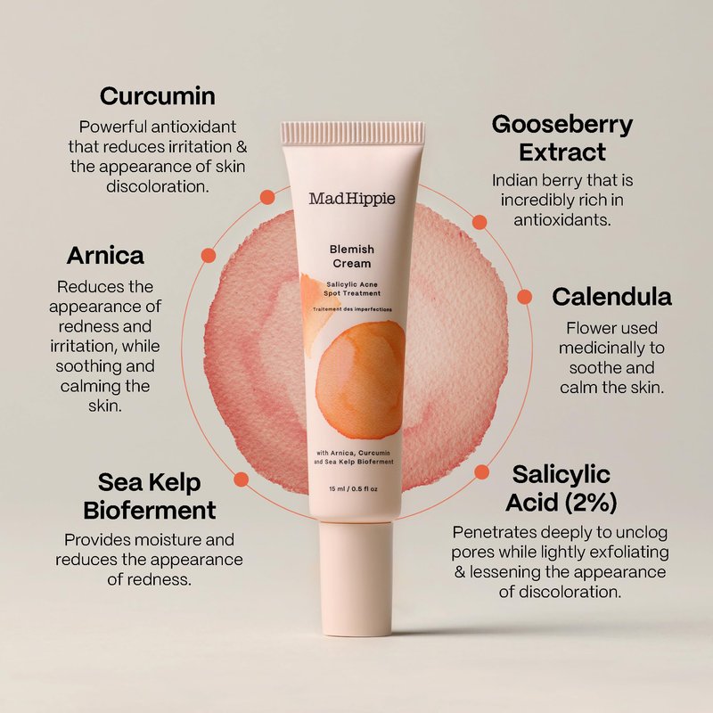 - SKIN CARE FOR SMOOTH SKIN: The Mad Hippie Blemish Cream stops acne, pimples, and zits in their tracks while clean and natural skin soothers tame inflamed skin.