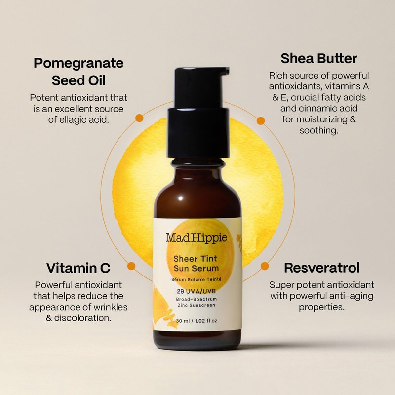 Mad Hippie Sheer Tint Sun Serum (Light/Medium), Tinted Moisturizer for Face with SPF 29, Vitamin C, Hyaluronic Acid, Tinted Sunscreen for Face in a Recyclable Glass Bottle, Reef Safe, 1.02 Oz