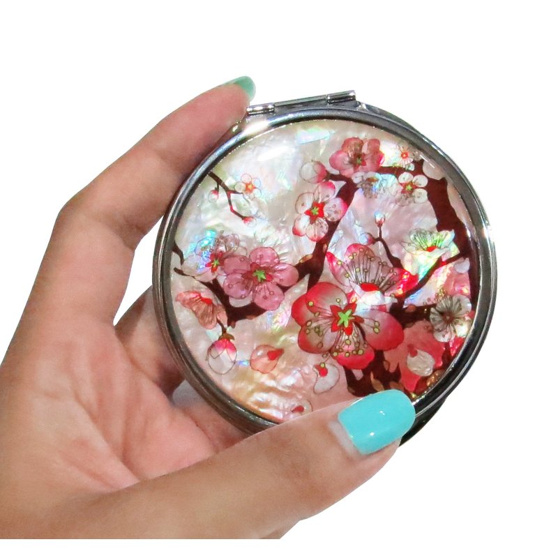 "Does your portable mirror match your style and personality?" Mother of pearl makeup compact hand mirror. Slim, high quality, and fashionable compact mirror that reflects a unique style and personality! Pink in color apricot tree design Durable metal case with protective lacquer finish. Dual mirror design with 2.5 magnification 2.8" (7cm) diameter, easily fits in your hand or pocket. Mother of Pearl? This item was crafted using traditional Korean mother of pearl inlay and lacquer-ware techniques! Oysters, mollusks, and abalone shells are lined naturally with crystals of calcium carbonate. These crystals produce iridescent colors when light is shined on them. Shells are pressed into a sheet, a design is imprinted and then glazed with lacquer.Traditional Korean mother of pearl and lacquer ware items have been popular in Asia since the Goryeo dynasty 932-1392 AD. The combination of mother of pearl and lacquer produces a glossy finish that shines and reflects in the light! Unique gift! Shipped in a stylish box, this mirror is ideal for gift giving! A special gift for all occasions: Weddings, birthday's, Christmas, anniversaries, graduations.