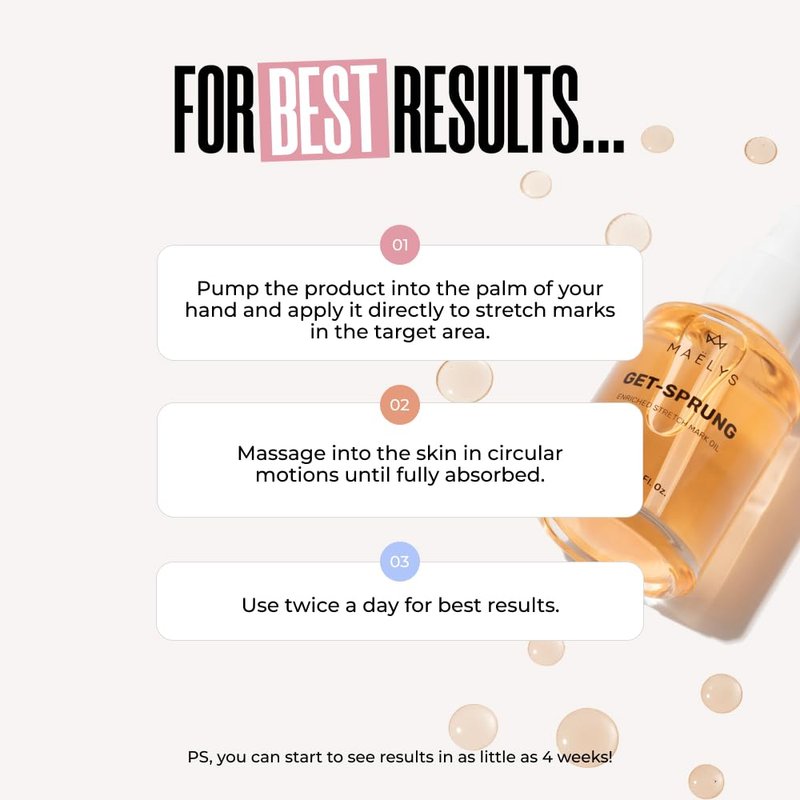 - Pump Get-Sprung Enriched StretchMark Oil into the palm of your hand, apply it to the target area, and massage thoroughly until fully absorbed. Apply every day, twice a day, to affected areas. An essential product to help with the appearance of stretch marks for all women, including expectant mothers.