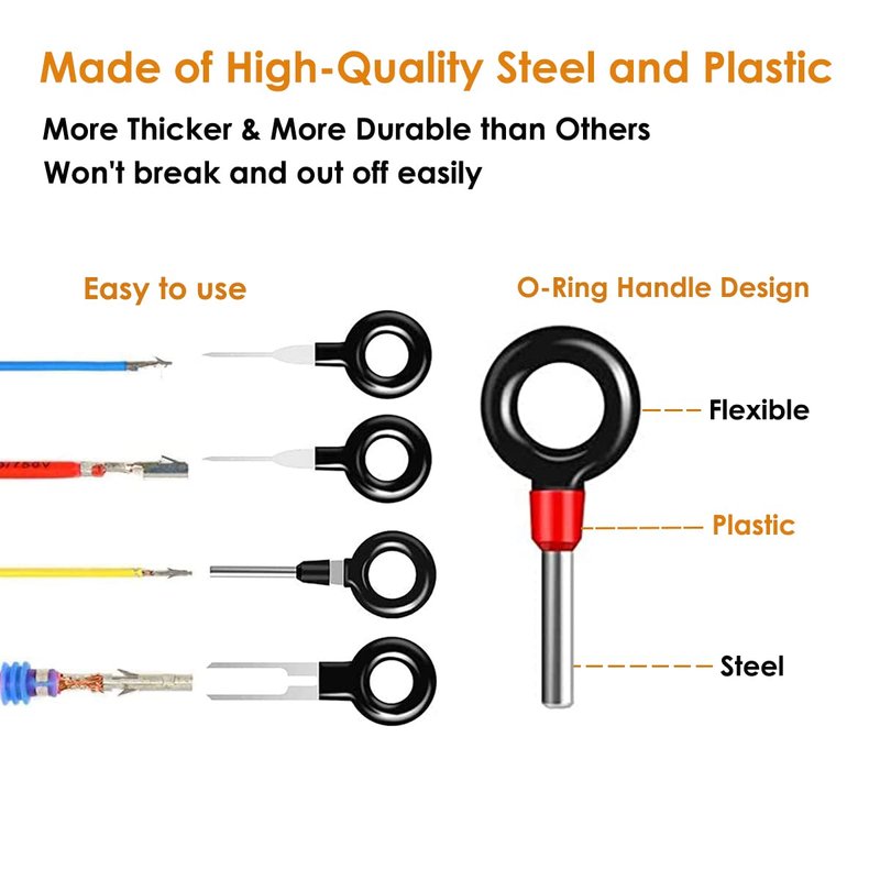- 【Easy to Use】 The electric pin remover tool is easy to use, just push and pull the terminal pins with connector removal tool for removal effortlessly from the wire harness connectors without any damage.The O ring handle make it more safe to operate the terminal pins connectors