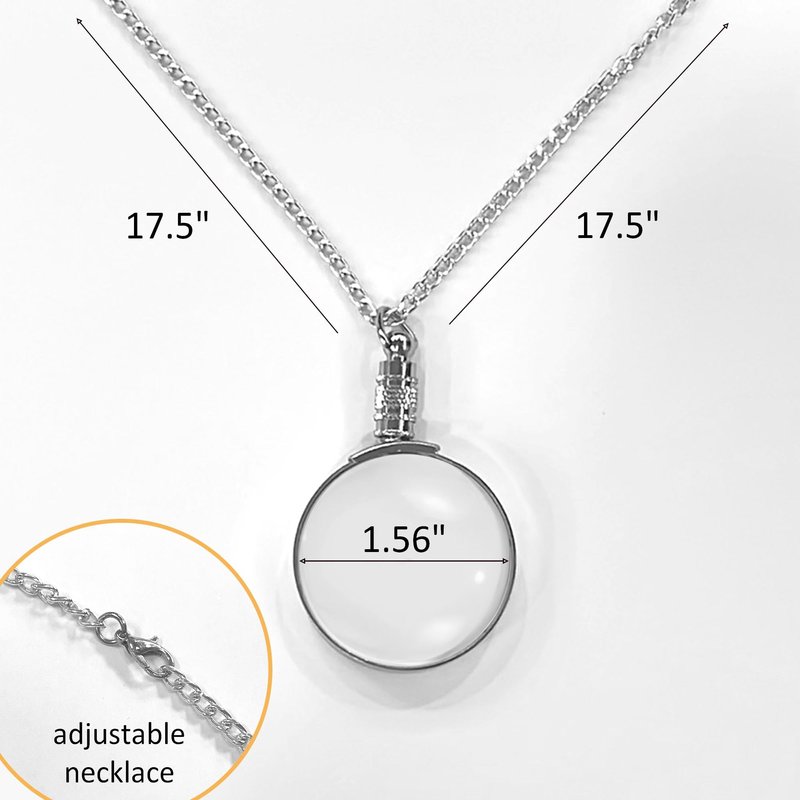3x silver necklace magnifying glass / pendant magnifier with 26" matching chain and glass magnifying lens. The simple design and the strongest lens combine to create this beautiful 1.5-inch wide pendant magnifier. Wear it to work, shopping, at casual gatherings, or even to fancy affairs. Includes a lovely 26-inch matching chain. Its classic, a clean design will complement any outfit and occasion.