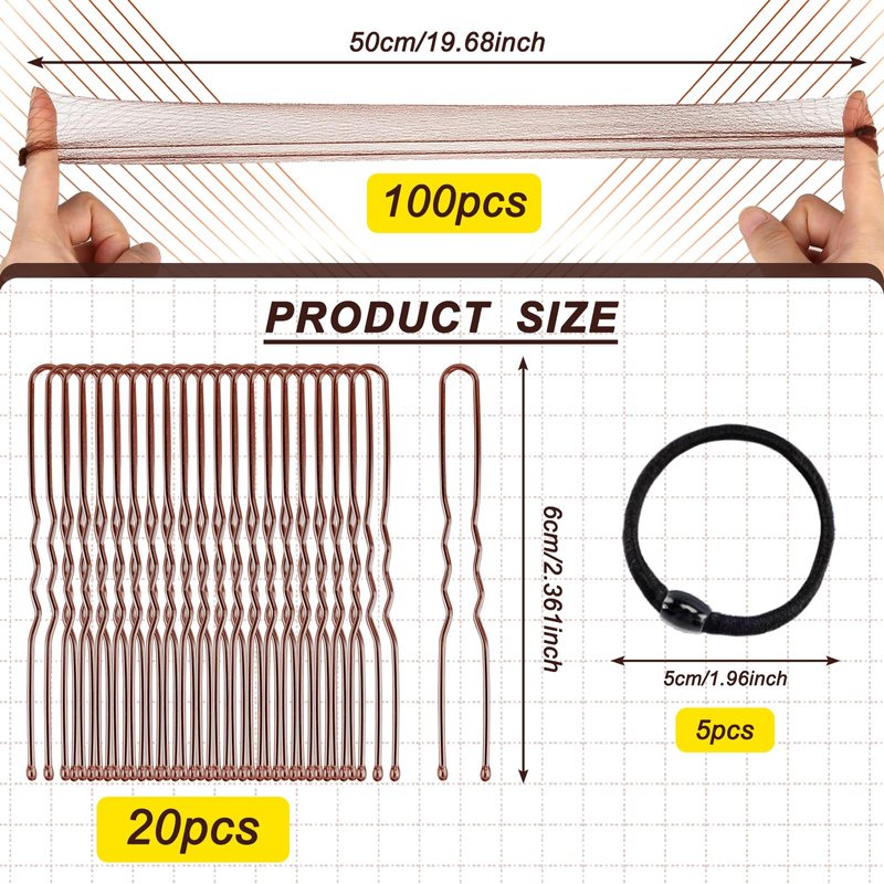 - 【125 Pcs Hair Net Set】You will get 100pcs 50cm/20inch brown hair nets and 20pcs 6cm/2.4inch brown U shaped hair pins and 5pcs black hair bands, help secure the bun. Plenty of hairnets for your daily use, a must-have in the bag of all dancers and service workers!
