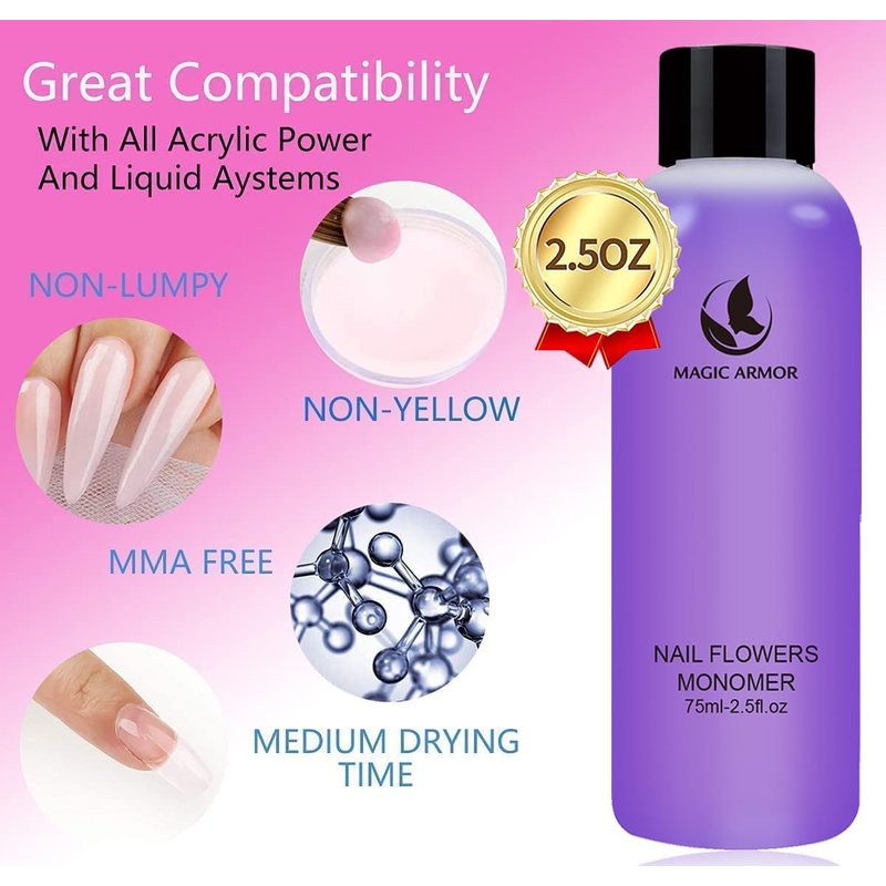 - 💜💜【Healthy Acrylic Liquid Monomer Set 】 Professional acrylic monomer and acrylic powder have a smell because they are not contain MMA;The Acrylic powder is wonderful to do french nails, acrylic nails, nail carving, nail extensions and nail decoration. The acrylic powder and liquid set can do manicure faster and no need for curing, preventing any skin damage.