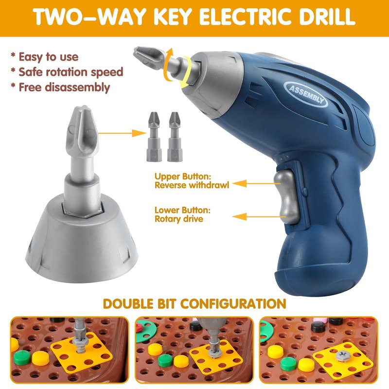 - 【Prmmium Material】Our creative mosaic drill set is made of high-quality ABS plastic, the edges are polished. The toy drill is powered by AA batteries (not include), speed is slow, no need to worry about hurting the child