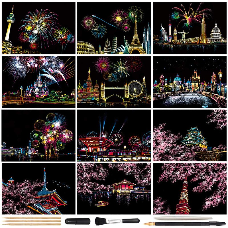 Magic Scratch Art Paper, Mini Envelope Postcard, Rainbow Night View Scratchboard for Adults and Kids, Art & Crafts Set: 12Sheets Scratch Cards & 7 Tools Drawing Pen, Clean Brush (Colorful Fireworks)