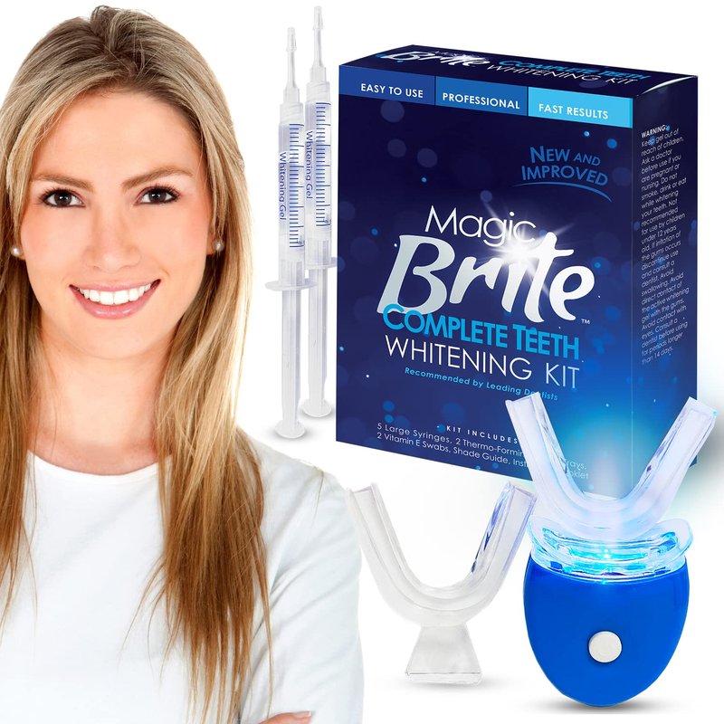 MagicBrite Complete Teeth Whitening Kit at Home Whitener - LED Light, 35% Carbamide Peroxide, 2 Mouth Trays, (3) 3ml Gel Syringes, Painless Effective