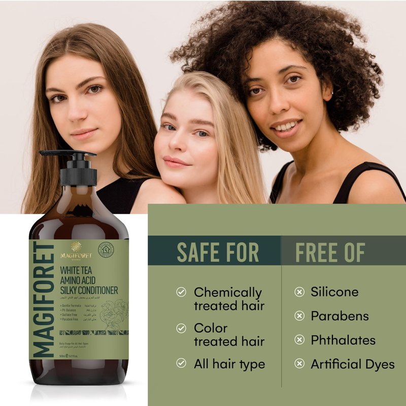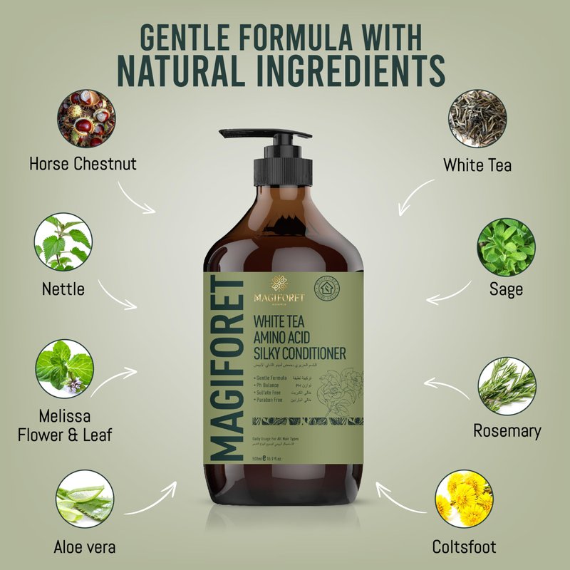 WHITE TEA ANTI-DANDRUFF & SCALP THERAPYSHAMPOO: Ingredients: AQUA, AMMONIUM LAURETH SULFATE, SODIUMLAUROYL GLUTAMATE, COCAMIDOPROPYL BETAINE, CITRIC ACID, POLYQUATERNIUM-10, PROPYLENEGLYCOL, CAMELLIA SINENSIS (WHITE TEA) LEAF EXTRACT, AESCULUS HIPPOCASTANUM (HORSE CHESTNUT)SEED EXTRACT, SALVIA OFFICINALIS (SAGE) LEAF EXTRACT, EQUISETUM ARVENSE EXTRACT,ROSMARINUS OFFICINALIS (ROSEMARY) LEAF EXTRACT, TUSSILAGO FARFARA EXTRACT, URTICADIOICA (NETTLE) EXTRACT, MELISSA OFFICINALIS LEAF EXTRACT, CHAMOMILLA RECUTITA(MATRICARIA) FLOWER EXTRACT, AMMONIUM HYDROXIDE, ALOE BARBADENSIS (ALOE VERA) LEAF EXTRACT, PARFUM, PHENOXYETHANOL Usage: Apply to wet hair and lather with a gentlemassaging motion. Rinse thoroughly with warm water and repeat if necessary. WHITE TEA AMINO ACID SILKY CONDITIONER: Ingredients: AQUA, CETYL ALCOHOL, STEARTRIMONIUMCHLORIDE, ETHYLHEXYL PALMITATE, AMODIMETHICONE, CETRIMONIUM CHLORIDE,TRIDECETH-10, CYCLOPENTASILOXANE, HYDROXYETHYLCELLULOSE, DIMETHICONE, MACADAMIATERNIFOLIA SEED OIL, CRAMBE ABYSSINICA SEED OIL, ORBIGNYA OLEIFERA SEED OIL, CAMELLIASINENSIS (WHITE TEA) LEAF EXTRACT, ALOE BARBADENSIS (ALOEVERA) LEAF EXTRACT, PARFUM, CITRIC ACID, PHENOXYETHANOL Usage: Applygenerously to towel dried hair. Distribute evenly throughout the hair. Leave onfor 2-3 minutes. Rinse thoroughly. Follow with MagiForet 9 Zero Water Treatmentfor further treatment.