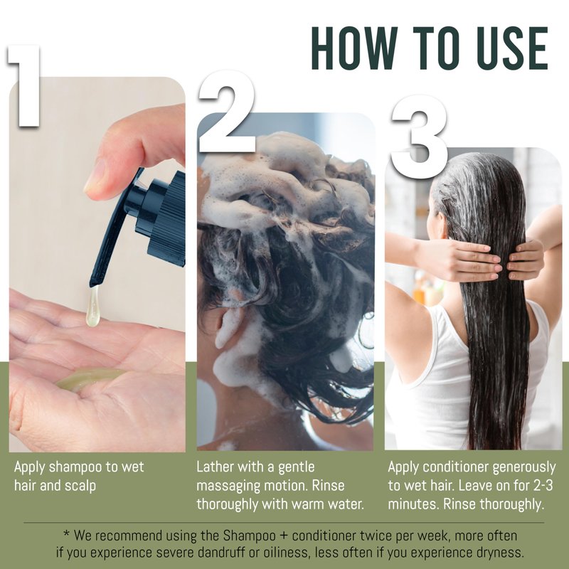 - Usage: We recommend using the Shampoo + conditioner twice per week, more often if you experience severe dandruff or oiliness, less often if you experience dryness. Apply to wet hair and lather with a gentle massaging motion. Rinse thoroughly with warm water and repeat if necessary.