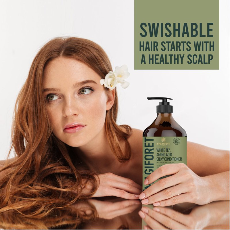- Clean + Hydrate + Moisture – The white tea shampoo cleans the clogged pores caused dandruff, gentle removes buildup, controls oil production and soothes itching & flaking. The amino acid conditioner contains the essential amino acid that scalp and hair needed, which hydrates and moistures dry and sensitive scalp, restores the scalp's water-oil balance.