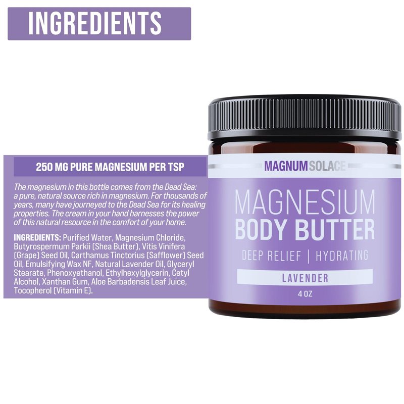 - SUPERCONCENTRATED: Magnum Solace Magnesium Body Butter contains 250 mg magnesium per tsp (6,000 mg per jar). Compare with other topical magnesium chloride products, this packs a punch!