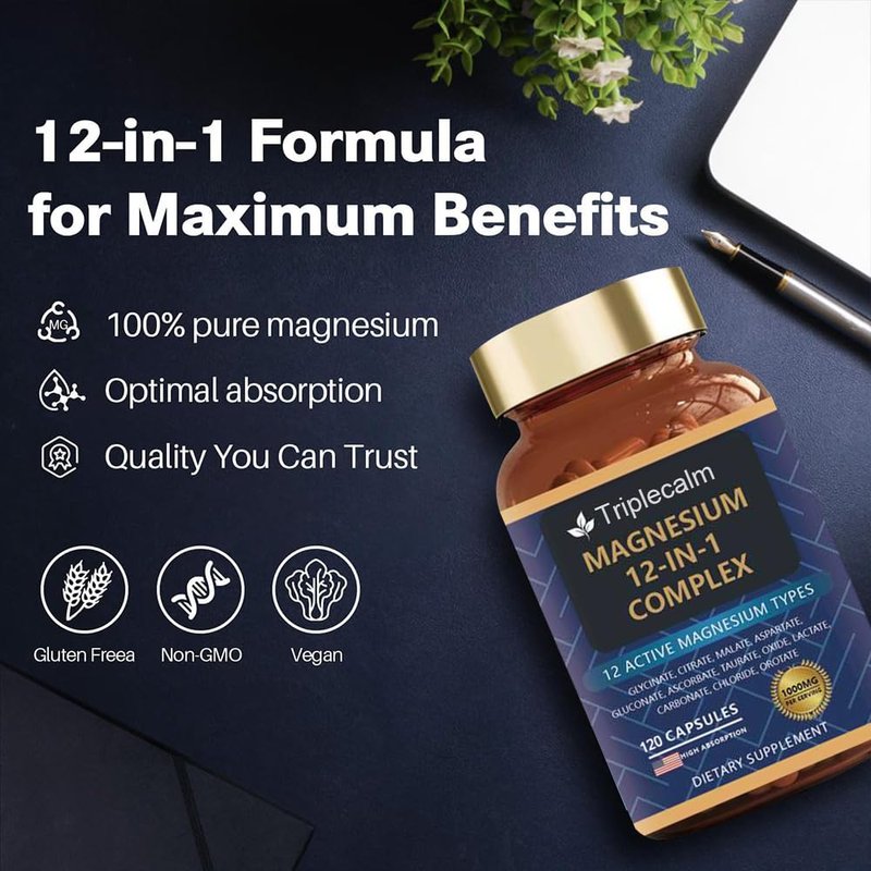 Magnesium Complex 12 in 1 Supplement - 12 Elemental 1000mg - Magnesium Glycinate, Citrate, Malate, Taurate - High Absorption,for Muscle, Nerve & Sleep Support - 120 Capsules