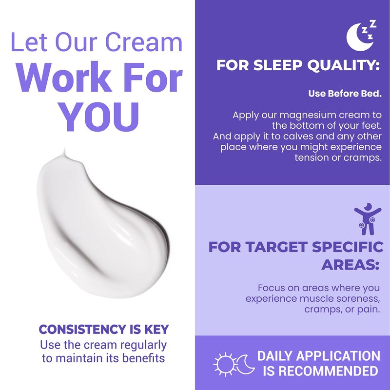 Imagine ending a long, stressful day with a calming bedtime routine. After a warm bath, apply the Magnesium Cream to your feet and calves. The gentle, lavender-scented cream absorbs quickly, allowing you to drift into a restful sleep without any greasy residue. Wake up refreshed, with reduced muscle tension and increased energy levels to tackle the day ahead.