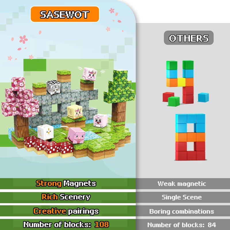 - 【108 MAGNETIC BLOCKS TO BUILD 6 SCENES】2024 Upgraded Magnetic Cube Garden Set with 108 pieces magnetic blocks and 14 block types.A larger number of magnetic blocks provides more creative possibilities.Children can go from building simple cherry blossom trees to challenging garden constructions,bring their pals - unicorns,zebras and other animals-and use their imagination to create a magnetic world of their own.