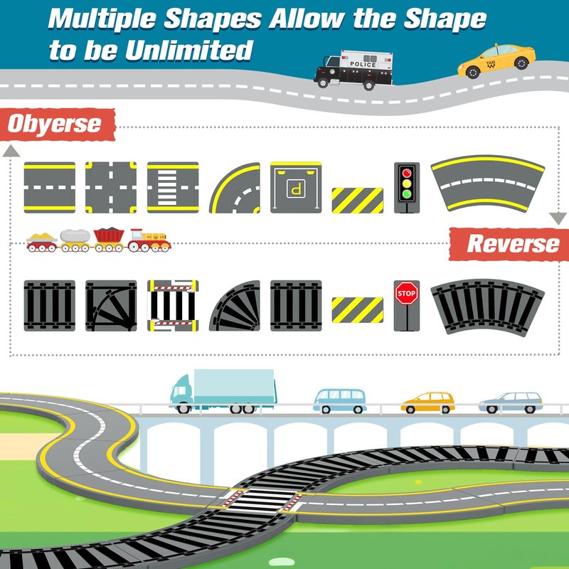 - MAGNETIC ROAD EASY to BUILD and MAKE KIDS MORE CONFIDENT: Road magnetic tiles create more scenes and more fun than normal magnetic blocks. Kids can build roads in different home areas to create various environments and scenes. Traffic signs, buildings, and vehicles can be added to complete the city construction. Every passionate encounter with children's toys such as cars, trucks, cranes, and excavators can expand kid's imagination
