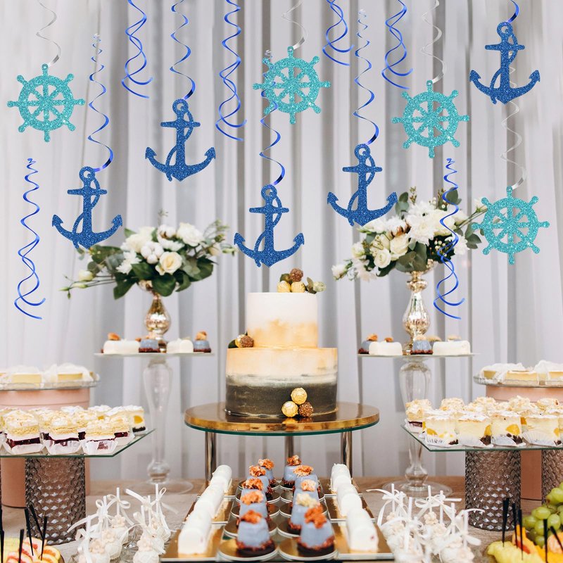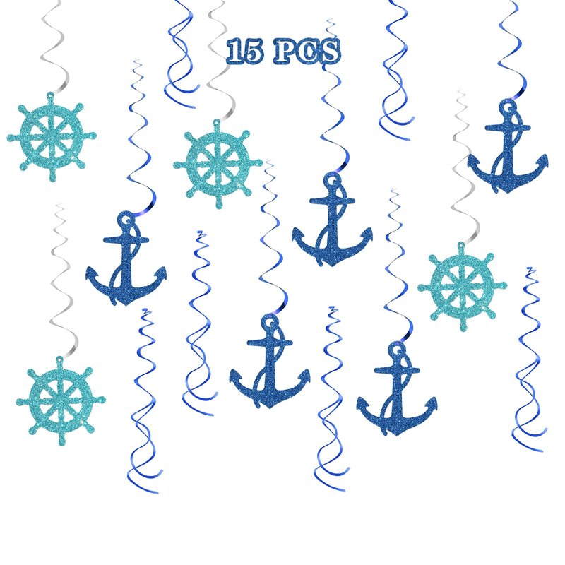 Maicaiffe Nautical Hanging Swirl Decorations - Glitter 15 Pcs Ship Anchor Baby Shower Party Supplies - Wedding - Engagement - Birthday Streamers - Nautical Sailor Party Foil Swirls Ceiling Decorations