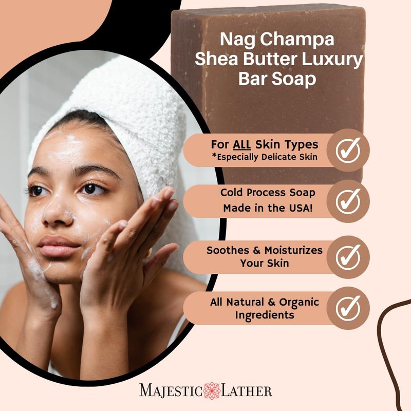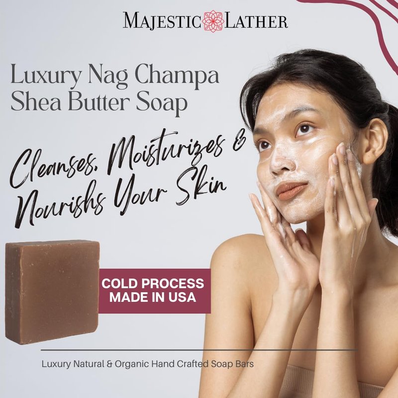 Majestic Lather Nag Champa Luxury Handmade Bar Soap for Face & Body. Gentle Cleansing, Moisturizing & Nourishing - Shea Butter & Natural Oils. Cold Process. Vegan. For All Skin Types.5.0 Oz.