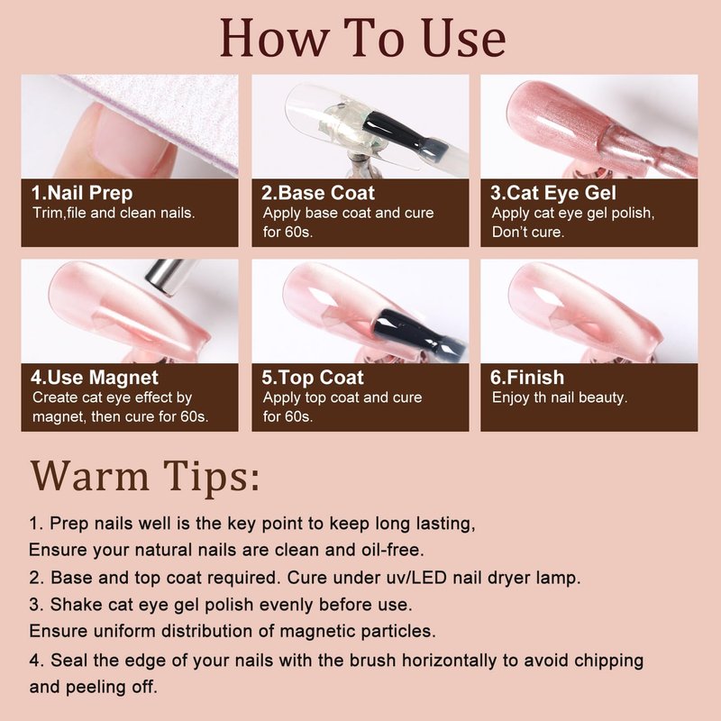 - WARM TIPS:You need to use some skills to apply this cat eye gel nail polish, as for beginners, we suggest you can learn more about from videos, the practice can get a satisfying effect.