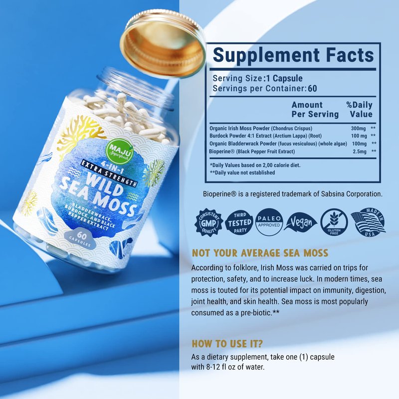 - WILD HARVESTED 4-IN-1 SEAMOSS PILL - Maju's seamoss capsule combination combined Irish Sea Moss, Bladder Wrack, Burdock Root, and Black Pepper (for enhanced absorption). Are you looking for sea moss capsule formula that works? Give this marine algae combo a try.