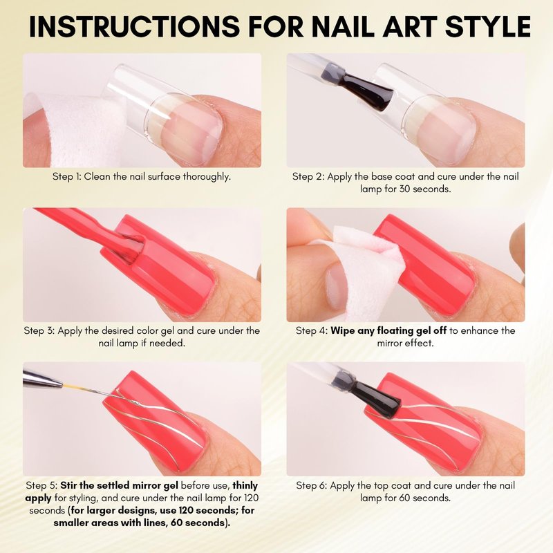 - 【Curing Needed】This mirror shine gel cannot be air dried, it needs to be cured under UV or LED light. To achieve a better effect, we highly recommend you to cure each coat for at least 60s under LED light or 2mins under UV light.