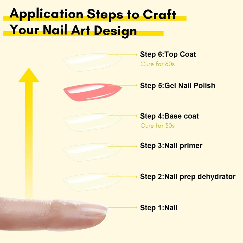 - Nail Lamp Required: Cure the base and top coat under a UV or LED nail lamp for 60-90 seconds. Cure times may vary based on the lamp used and the amount of gel applied. A skin test before use is recommended.