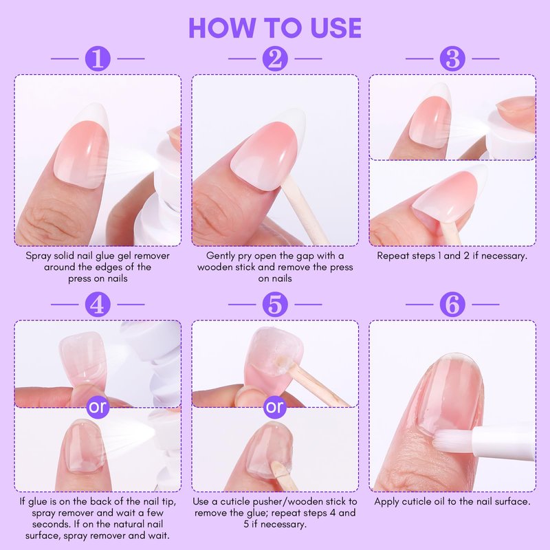 - Nail Glue Remover: This spray nail glue remover has a capacity of 60ml and includes 5 wooden stick removal tools. It efficiently removes solid nail glue gel from press on nails or nail tips for quick and convenient use
