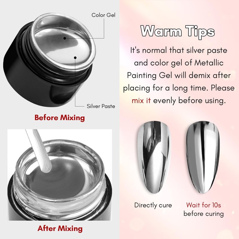 - NOTICE - The gel glue is only used for nail and no direct contact with the skin. If you feel unwell, instantly stop using. We recommend doing a skin test before use chrome silver gel polish and stop using it immediately if you experience an allergic reaction. Please feel free to reach out to us with any questions regarding the product and we will be happy to assist you.