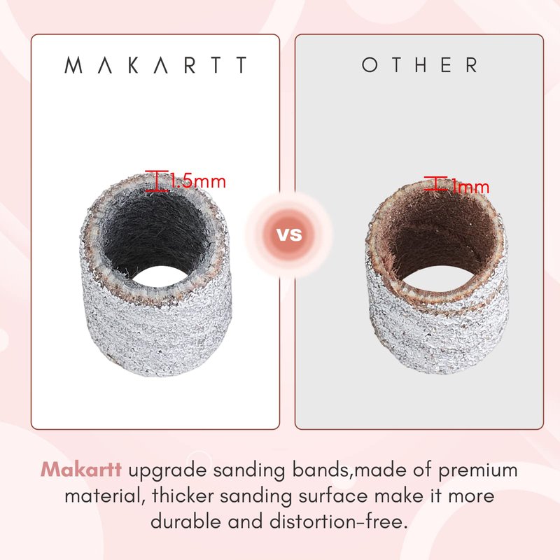 - Makartt Upgrade Sanding File: Made of upgrade 1.5mm thicker sandpaper,the nail sanding bands is harder and more durable ensure that it will not fall apart during use. Create a comfort nail experience when removing gel nails, shaping acrylic nails and blending for a smooth surface. Great for backfilling, removing any imperfections after acrylic nail application