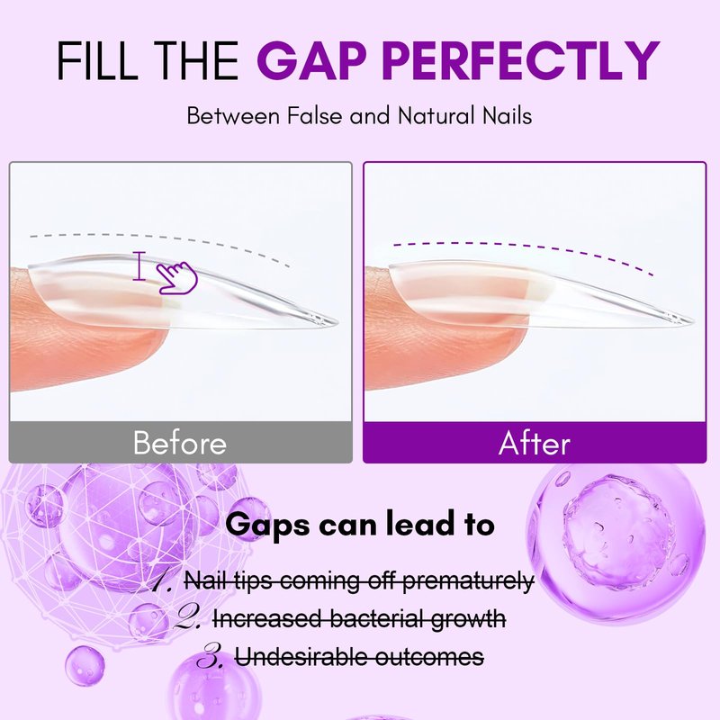 - Mess-Free Application: The solid nail gel, non-flowing texture allows for easy one-handed operation, eliminating the need to press down on the nail tip with your other hand. It also fills gaps between natural nails and fake tips for a stronger, natural-looking bond. Plus, it won’t stick to your hands, making cleanup a breeze
