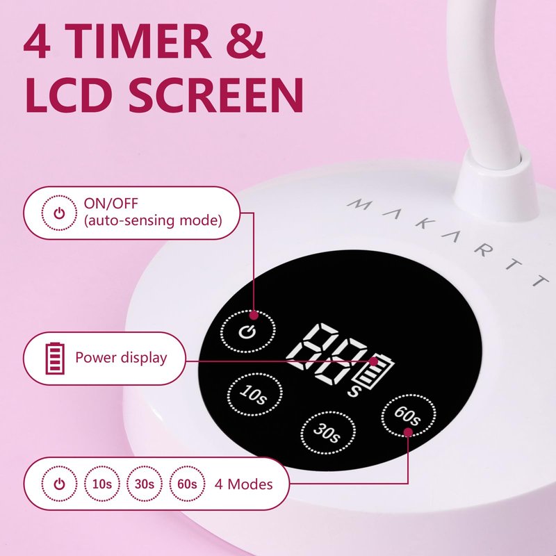 - 4 Timmer Settings & LCD Touch Buttons: This nail curing lamp comes with 4 timer settings: 90s(default timer when standby, auto-sensing)/ 60s/ 30s /10s. Gently Touch the button to turn the gel nail light on and choose the timer as needed, and built-in LCD screen will clearly show the battery capacity and timer status.