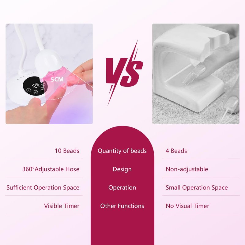 Makartt Touch Switch Nail Lamp-10W Gel Lamp Mini Wireless Nail Lamp for Gel Nail Polish, Rechargeable LED Flash Cure Light Quick Drying Goose Neck 360° Rotation U V Lamp for Nail Salon Features: 1. Smart infrared sensor design: Hands-in, light-on, hands-out, light-off. 2. Clear LCD Screen: Show the battery capacity and timer status clearly, making this UV lamp for nails easy to control. 3. 4 Timer setting: This nail uv light come with 4 timers: 90s(default setting and suto-sensing)/ 60s/ 30s/ 10s. 4. 360° Adjustable Hose: The gel UV-led nail lamp could be adjusted to any angle and direction as needed. 5. Open Curing Space: Perfect for gelly nail tip curing, fast-fixing nail rhinestones, and liner gel polish. Specification: 10pcs Red UV/LED Beads Battery Capacity: 1800mAh Max Power: 10W Wavelength: 365nm- 635nm Timer: 90s/60s/30s/10s
