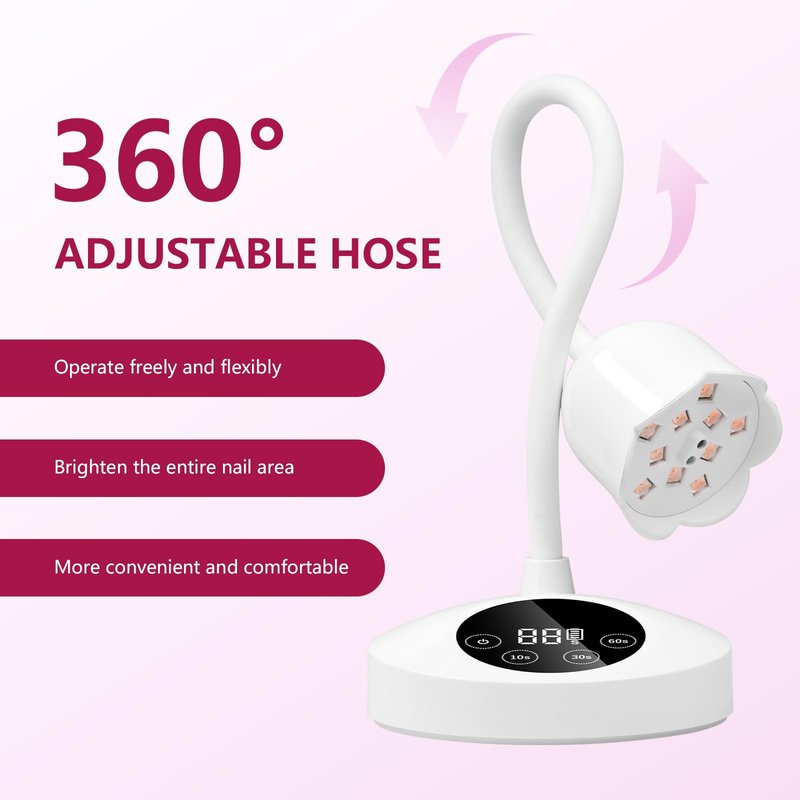 - Portable & Flexible Gooseneck: The gel lamp is Size(Unfolded) is 3.7 inch*3.7 inch*12.8 inch(Flexible hose:9.6 inch), Small and Lightweight. The portable nail cure light with gooseneck can be bent 360 degrees freely, so that uv lamp height and direction of the uv light can be flexibly adjusted, which make wireless gel nail lamp always find the right position.