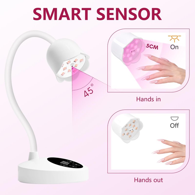 - Auto-sensing Small UV Nail Lamp: Unique flower design of nail cure lamp with a smart infrared sensor, hand-in, light on, and hands-out, light off. Open curing space provides convenience for false nail tip press on nails soft gel nail glue curing, quickly fixes nail charms and gel polish drawing, and improves the efficiency of nail art creation. It is a perfect E-nail tool for nail technicians and nail salons.