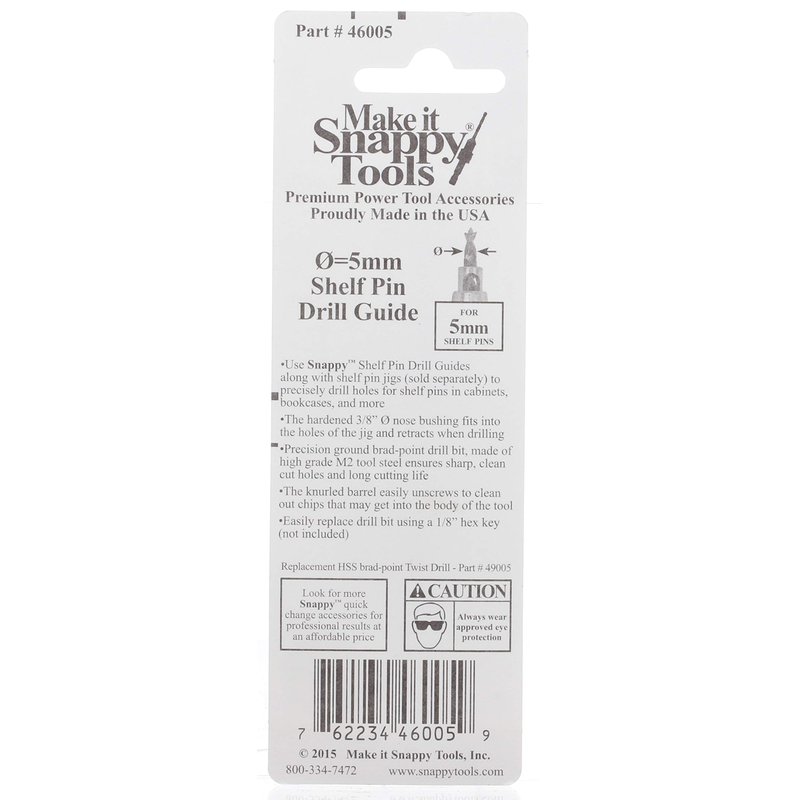 Make it Snappy Tools 46005 - 5mm Shelf Pin HSS Twist Drill Guide, Drill Holes For Standard Shelf Pins, 1/4-Inch Hex Power Bit Shank
