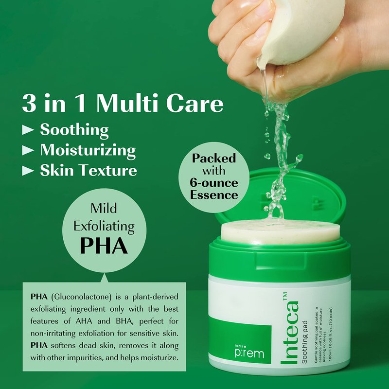MAKEPREM INTECA Intensive Soothing CICA Facial Toner Pads 70 Unbleached 100% Cotton PHA Mild Exfoliating Vegan 6oz Serum Nano-Sized Centella Instant Calming Effect Acne-Prone Irritated Sensitive Skin