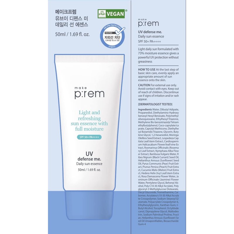 MAKEPREM UVA UVB Defense Me Daily Sun Essence VEGAN Makeup Sunscreen Gel SPF 50+ PA++++ 1.69 Fl Oz Reef-Safe Moisture Sunblock Strong UV Blue Ray Broad Protection Dry Oily Sensitive Acne-Prone Skin
