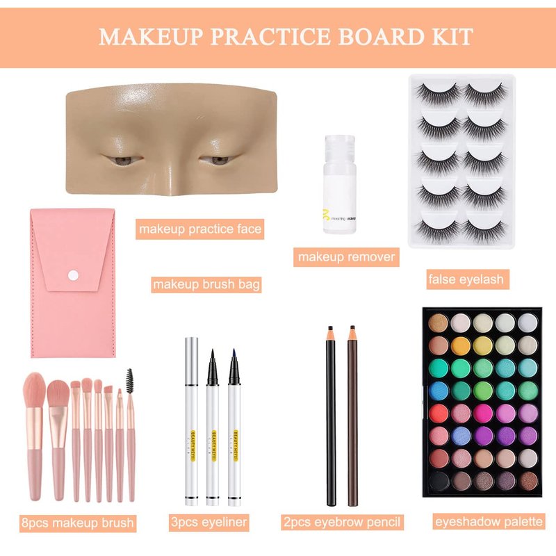 - Aibipo makeup practice board kit comes with everything eyes makeup practice needs, including Practice Makeup Face (light yellow), Eyeshadow Palette, Makeup Brush, Eyebrow pencil, Eyeliner, False Eyelash and Makeup Remover. Complete make up mannequin face set makes makeup easier. It is a perfect gift for daughters, beauty students, women to practice makeup or facial massage