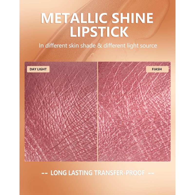- Transfer proof & Long Lasting Lipstick: After it sets, this metallic lip gloss is ready to stay put. Get pro full-coverage color without worrying that your pearlescent lipstick will transfer to your coffee cup. Oil-based foods or lip toppers may affect the long wear.