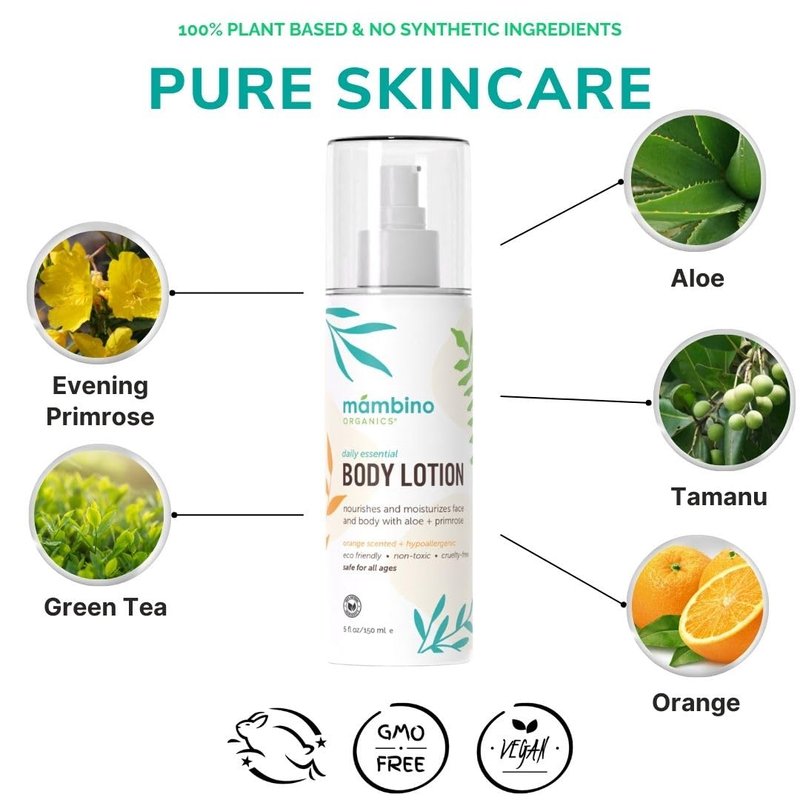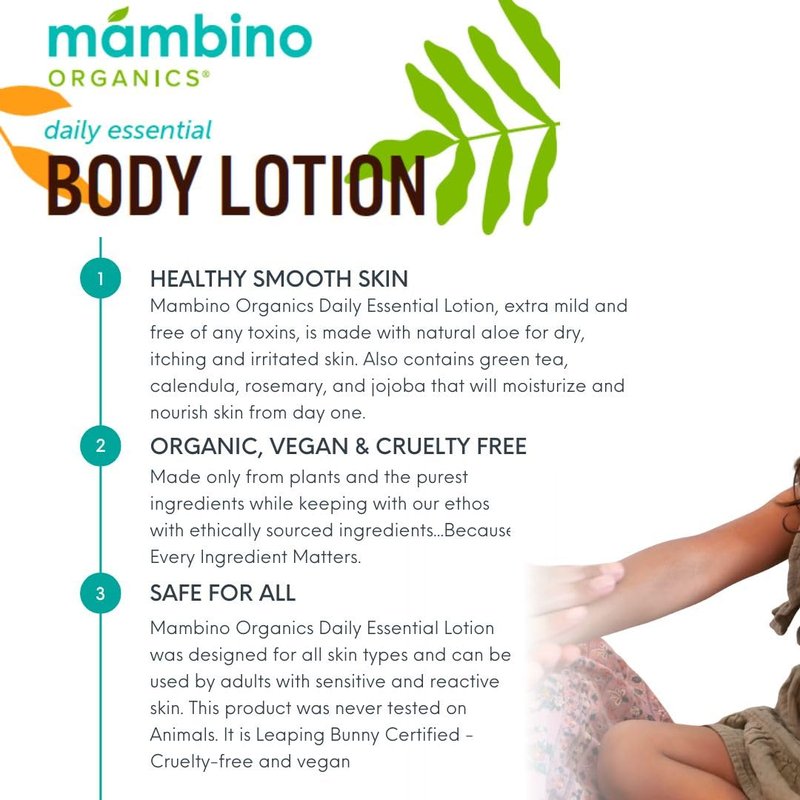 - HEALTHY SMOOTH SKIN: Mambino Organics Daily Essential Lotion, extra mild and free of any toxins, is made with natural aloe for dry, itching and irritated skin. Also contains green tea, calendula, rosemary, and jojoba that will moisturize and nourish skin from day one.