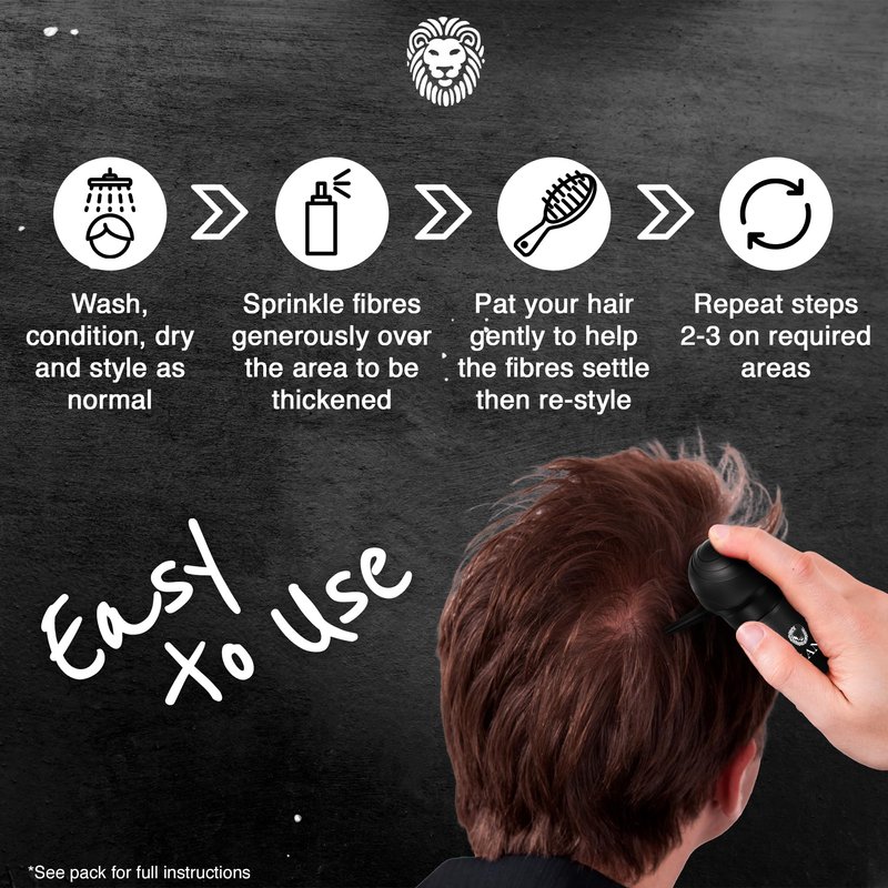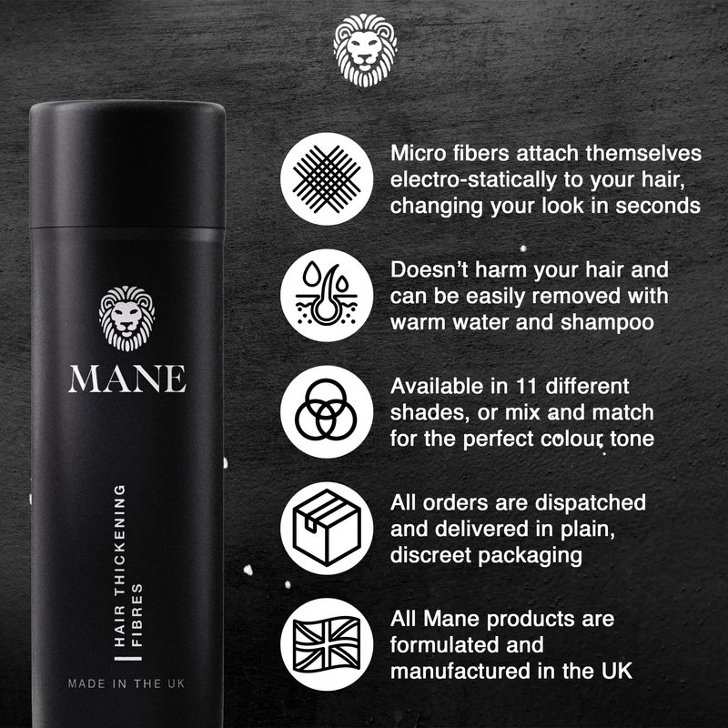 Rewind time with Mane Hair Thickening Fibers and reclaim your crowning glory, scientifically developed for a natural look in 11 blendable colors. Whatever shade or shape of hair, however old or young, Mane Hair Thickening Fibers will restore a youthful, natural thickness to your hair. Curly, straight, thin, thinning, man, woman β our scientifically developed hair thickening powder will give you back your confidence in seconds. Available in 10 shades, which you can mix and match to find the perfect color, our follicle booster formula has been scientifically developed to tackle thinning roots and crowns. Each fiber is just 2mm, allowing them to bond with even the thinnest and lightest of individual hairs. For a natural looking, fuller head of hair, look no further. Our hair fiber for men and women requires just a few simple shakes to affected areas β apply in seconds, enjoy for hours. Designed to be lightweight and lock to your remaining hair, our hair cover up solution delivers fully covered hair and thick abundant locks β rolling back the clock on your style. Get that spring back in your step with a hair powder volumizer that nobody will see, but everybody will notice.