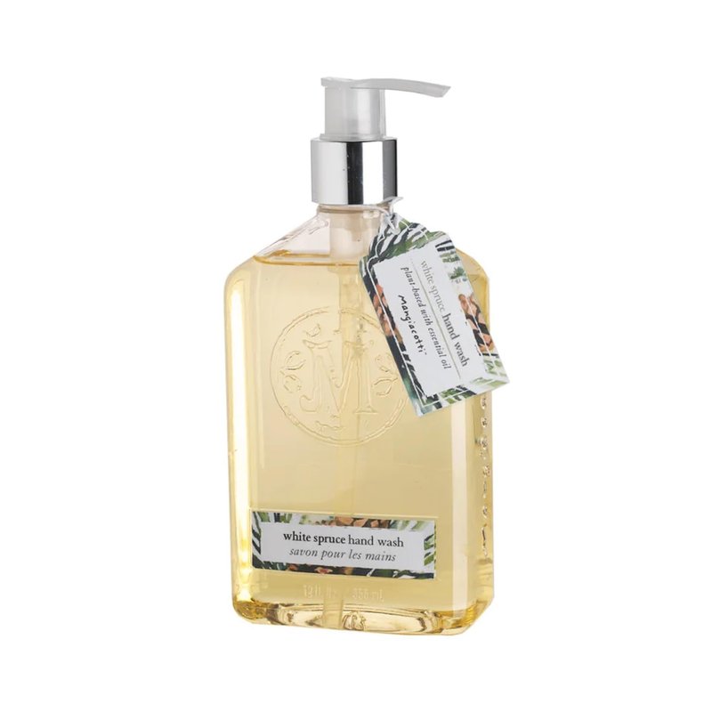- WHITE SPRUCE LIQUID HAND WASH Features a blend of herbaceous pine and spruce, combined with notes of rosemary, carnation, cedar, and hints of spice