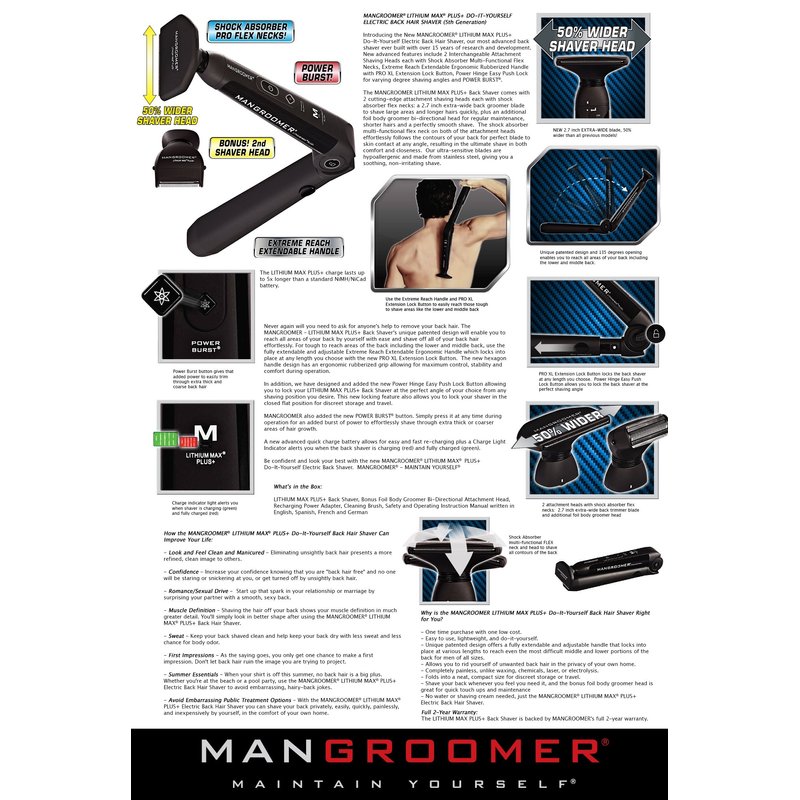 - The new Ultra-Wide attachment head is for use with the MANGROOMER lithium MAX PLUS+ back hair shaver and lithium MAX back hair shaver.