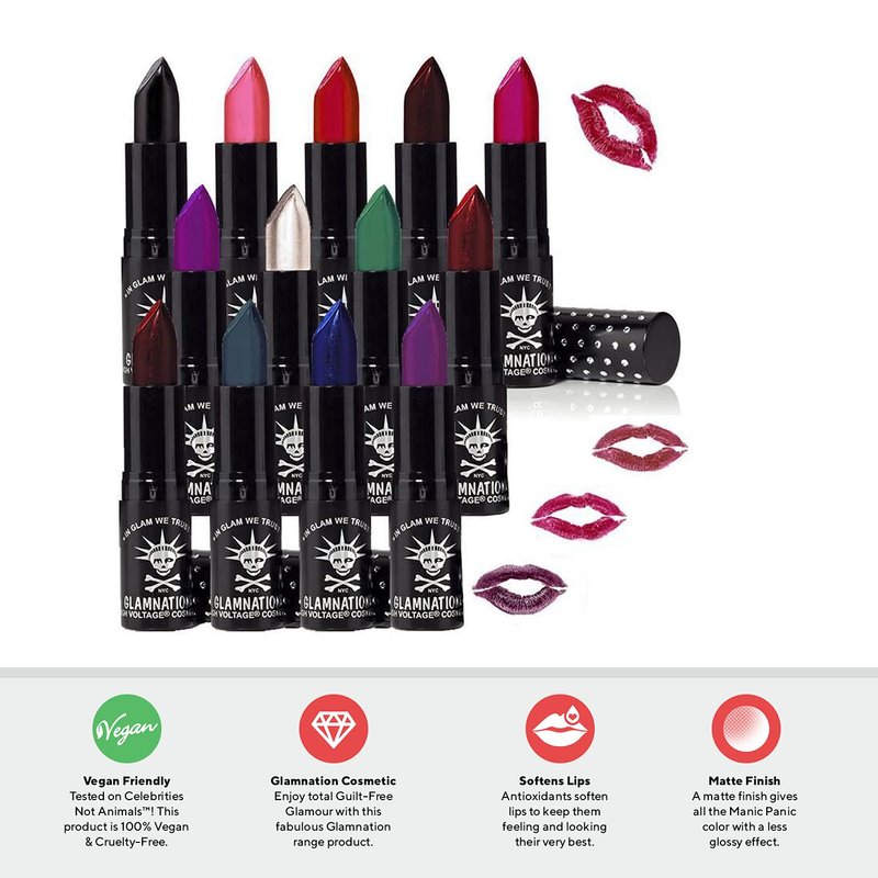 MANIC PANIC Raven Lethal Lipstick is a light, creamy shade of black that is long lasting and has antioxidants and natural moisturizers that makes this a great moisturizing lipstick. The Creamtones collection of lipsticks that have a buttery semi-matte finish & are Paraben Free, Gluten Free, Lead Free, Talc Free, and Cruelty Free. Tested on celebrities, not animals. Apply two coats of lipstick for maximum impact, or gently pat on with your fingers for a 'just bitten' look. For precision application use a lip brush or hard angled lip brush.Want a long lasting lip color that'll turn heads? Love strong, bold colors? Are you looking for a moisturizing lipstick that is Cruelty Free? Then you need to check out our amazing range of Lethal Lipsticks in a variety of 48 colors, with textures ranging from matte to semi-matte to opalescent to metallic to velvet. All come in a glamorous diamond-etched lipstick case. Creamtones lipsticks have a buttery semi-matte formula. Comes in 19 shades. Ice Metals lipsticks have a frosty, metallic formula. Comes in 8 shades. Kitten Colors lipsticks have a rich, velvety matte texture. Comes in 18 shades. Peacock Shimmers lipsticks have a shiny, opalescent formula. Comes in 3 shades.MANIC PANIC originated in 1977 as one of the first products sold at the Bespoke Boutique on St. Mark’s Place in NYC. The vivid shades, tints and hues stemmed from punk rock pioneers Tish and Snooky Bellomo, who transformed the beauty brand into a leading hair color revolution still going strong 40 years later. The New York native sisters, dubbed as the “Martha Stewarts of Punk Rock” believe in not only sharing colorful hair dye & makeup shades but also sharing a portion of their profits by donating 15% of MANIC PANIC’s annual profits to various charities.